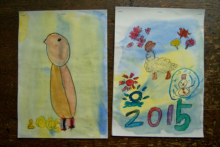 ようじクラスは10人、ゆっくりクラスは11人ですが、火〜土クラスはそれぞれ12人づついます。‥ということはクラスの仲間全員の作品を1ヶ月に1枚づつに貼れるということ。しかもカレンダーですから、その子の作品を1ヶ月ずっと眺められ、きっと名前とその人の作品(個性)を感じる機会にもなるのではないかと思っています。どうぞ家族の人たちも毎月楽しみにめくってくださいね。