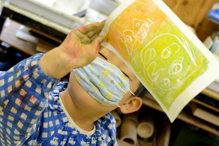 ようじクラスとゆっくりクラスでは初めにクレヨンで線画を描いてから紙を濡らして専用の絵の具でにじませて塗る方法。火〜土クラスは逆で、先にぬらしえでベースをつくり、乾かしてから上にダーマトグラフや水彩絵の具で絵を描きました。どちらもぬらしえが子どもたちの絵をやさしく包んでいます。