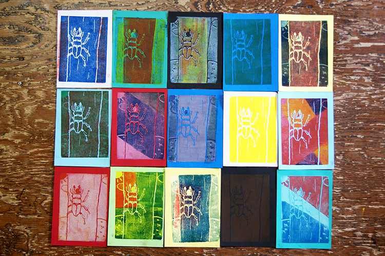 他のクラスの人たちごめんなさい。上記4クラスだけはスチレンはんがに2週かけたので一人で2版つくった人も多く、作品も沢山ありました。そこで自分の作品のベスト1を小さな額に入れ、ベスト2をラミネート加工しました。