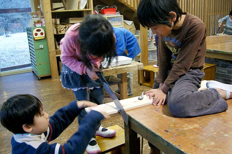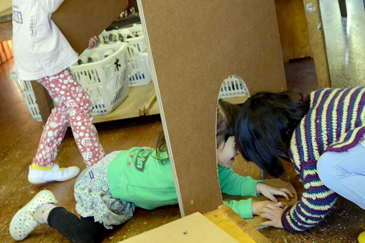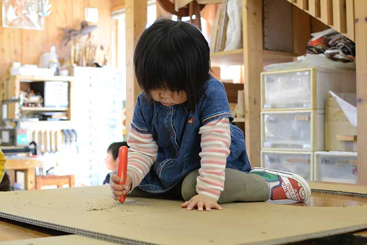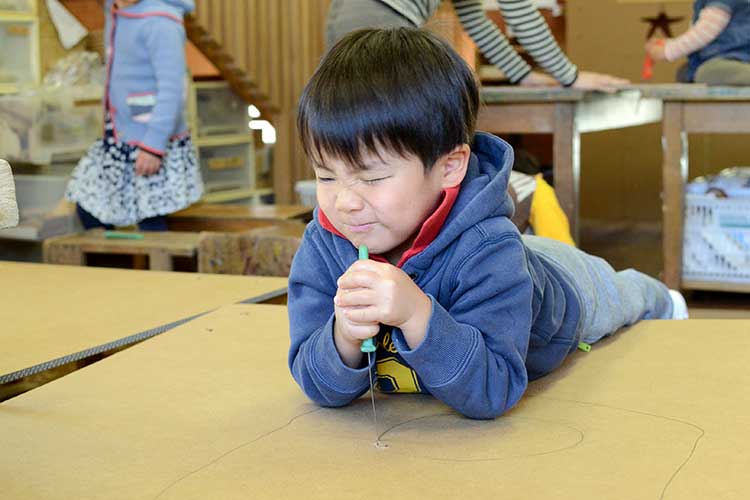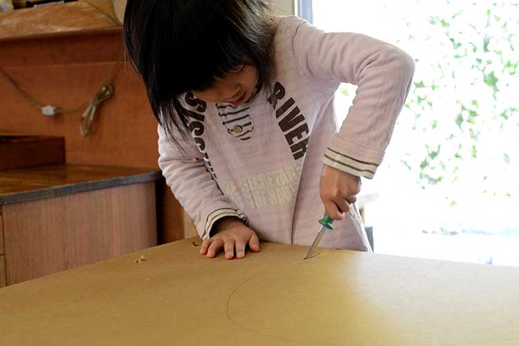 厚さが1センチもある特殊で頑丈なダンボールですから大人が切るのも大変なのですが、それを3歳の子にも切らせていると聞いてそのダンボール会社の人もびっくりしていました。でも子どもたちは張り切っているんですよ。窓やドアを一つ切り取るだけに1時間くらいかかりますが、ものすごく大変なぶん喜びもひとしお!