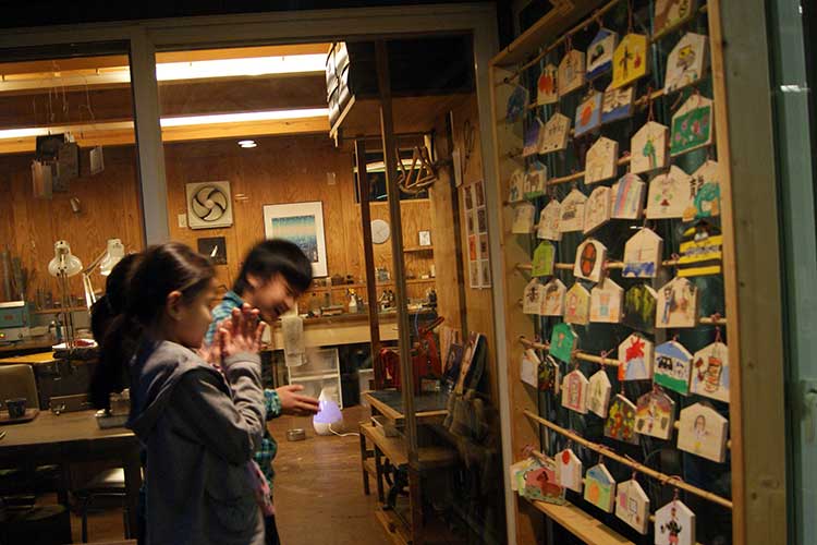 絵馬はひのきの板を寸法通りに切るところから始まります。やすりがけも丁寧にていねいに‥。全ての作業で「願いを込めながらやると叶うかも〜」と言うとまた真面目にやる子どもたちのかわいいこと。願い事はすぐに決めてパッパと書く子もいれば1時間以上もずっと悩んで書けない子もいます。裏面の絵もしかり。ここにもしっかり個性が出ています。