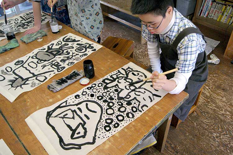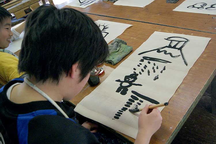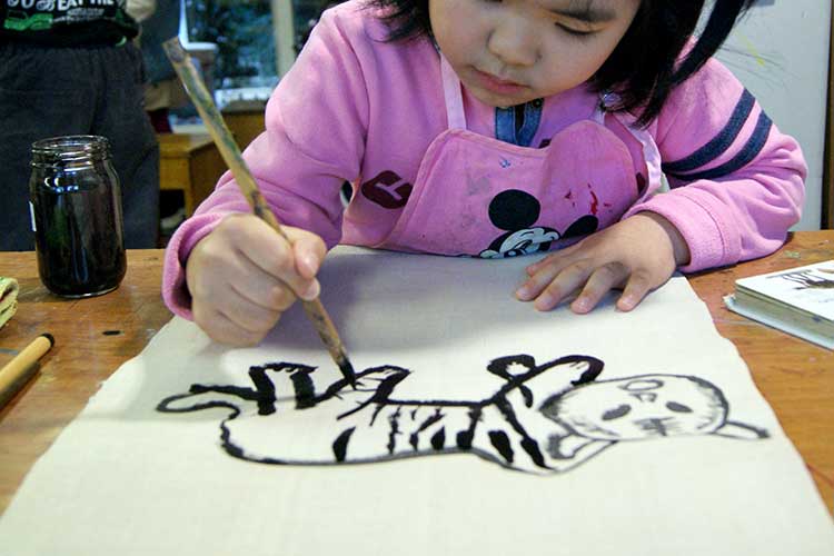 土曜クラスの掛け軸は一日で出来るように設定しました。材料は昔の絹の反物ですからとてもしっかりしていて気品もある感じです。それに墨汁で好きなように描いていきました。薄めた墨汁も使います。