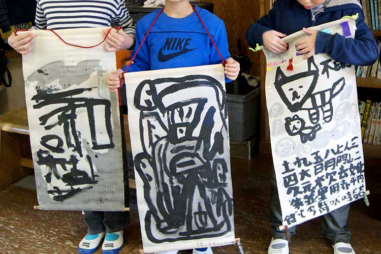 月〜金クラスは絵馬づくり、ようじクラスはダンボールの家づくりの途中、そして土曜クラスは掛け軸をつくりました。その一部を紹介しますね。