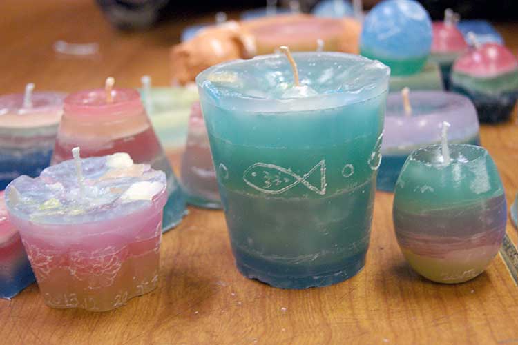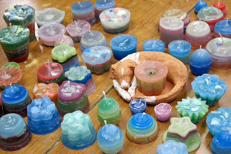 カップの形もさまざま、色もそれぞれ好みでつくっていきます。月〜金クラスは一人4個、ようじクラスと土曜クラスは一人3個できました。合計約300個のローソクに使用したパラフィンの量は25kgくらいでしょうか。床はシートを剥がした今もすべります‥。その奮闘の結晶であるかわいいローソクたち、昨夜は家々で火を灯されたでしょうね。9月につくったキャンドルホルダーも登場したことでしょう!