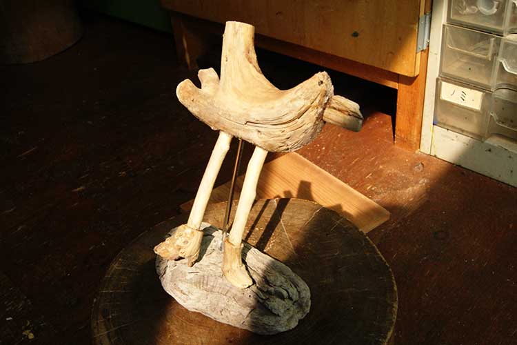 流木はそれだけで形がおもしろく味わいがあるのですが、問題は接着方法です。凸凹なのでボンドだけではくっつきません。ダボ(丸棒)、相釘、竹串を間に入れるやり方。外から釘やモクネジで止める方法。などなど、子どもたち一人一人のつくりたい物を見て、私やスタッフが一緒に頭や力を使います。道具もあれこれ駆使します。なので大変です!もちろん子どもたちも大変です。