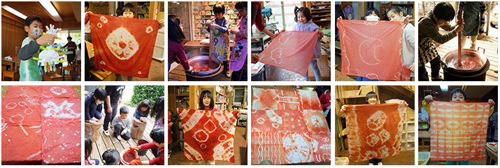 過去に藍染め(あお)とタマネギ染め(きいろ)は何度かやったので、あかい色の草木染めがやってみたくてアカネ染めもやりました。アカネの染料チップは専門店から購入しました。大きなシルクや木綿の布を思い思いにしばったりしてあとは大なべでぐつぐつ煮るだけ。広げてみたらおもいしろい模様と夕焼けのあかね色が出現!曜日によってあかの濃さが違うのもまた草木染めのおもしろさということで‥