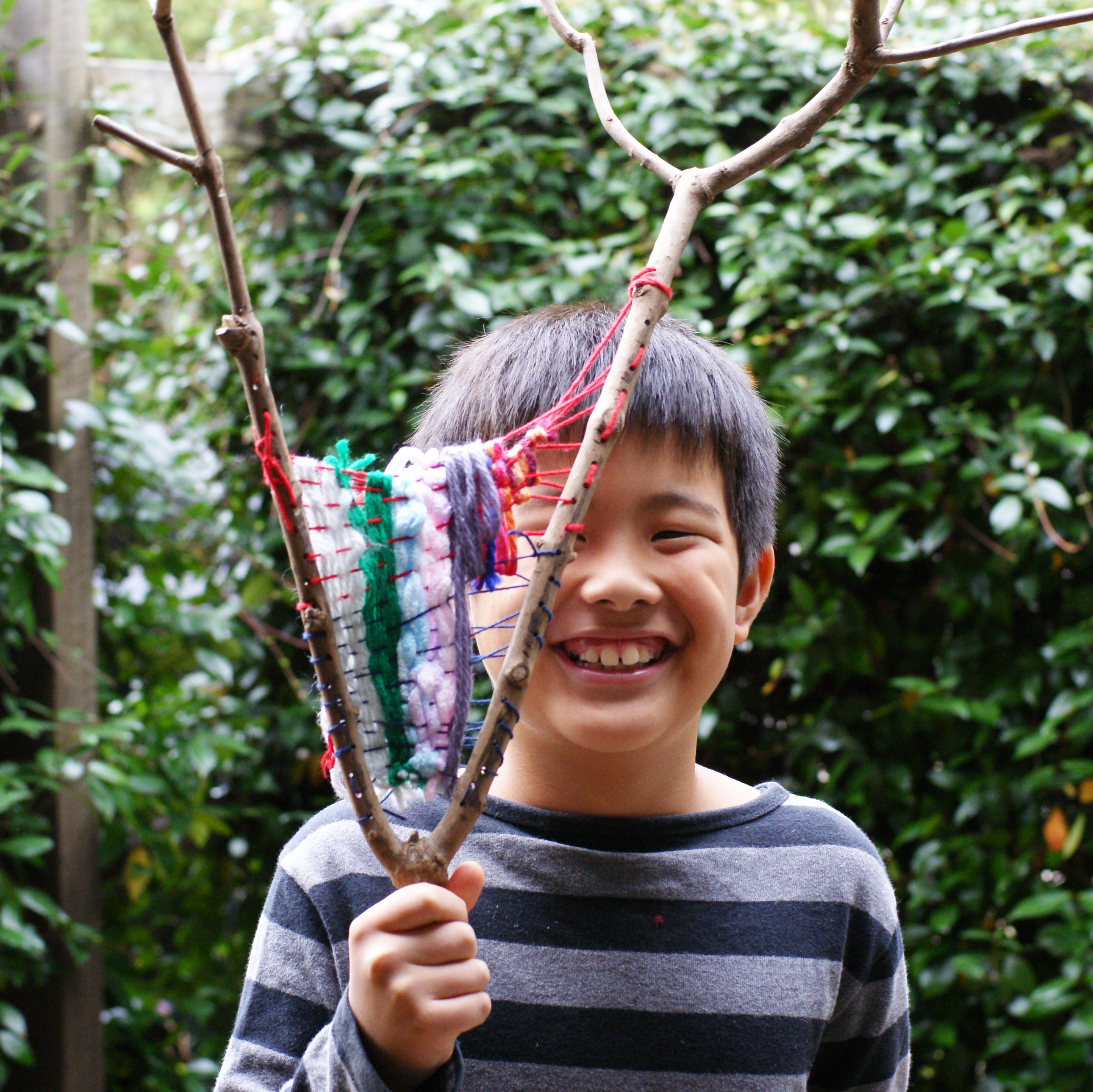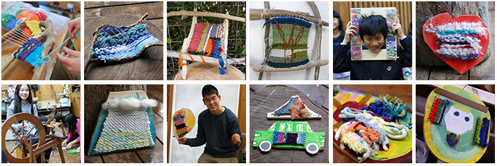 枝や流木、でんのこで好きな形に切った板をベースにして縦糸をかけ織っていきます。そして完成後も丸ごと作品になる織物です。ベースから外さないので織り方が間違えていてもゆるんゆるんでも大丈夫。好きなように自由にいろんな毛糸や裂き布、草までも織り込んだり出来ます。つむぎ車で紡いだ毛糸も使ってみたり、クラスやその年々によって違うやり方を楽しんで来ました。まるっとかわいい作品たちです。