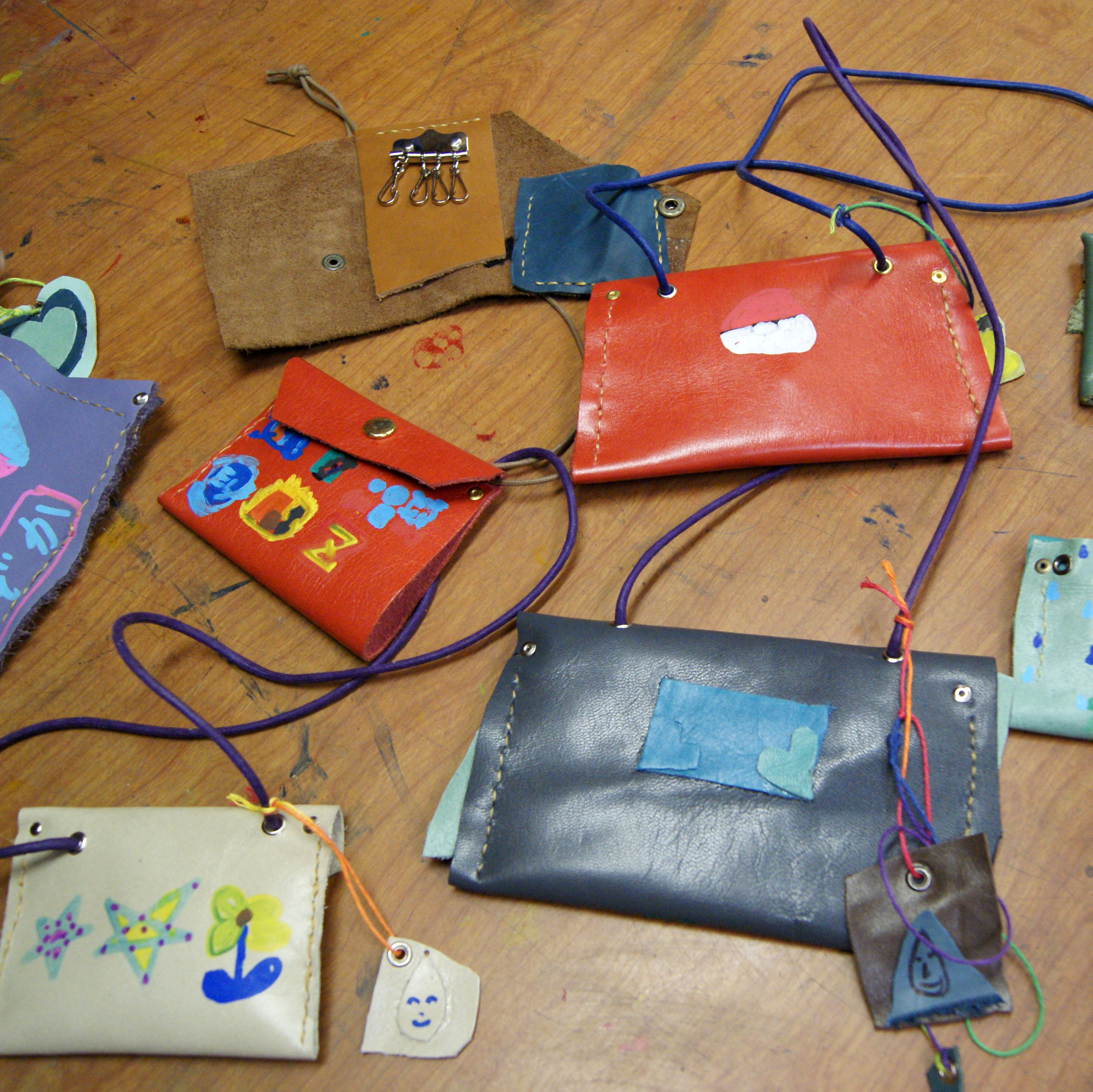 平日のクラスでは知り合いの革作家ウントエーゼさんにいただいた沢山の端革でパスケースやポシェット(サコッシュ)などをこしらえた年もあります。布と違う沢山のメリットや魅力がある革ですが、まだ布も縫ったことがない子どもたちは説明を聞いても「????」状態。ひとつひとつの作業をスタッフの助けも借りて乗り越えていきました。そんな苦労のつまった革作品たちはなんとも言えない味わいに満ちています。