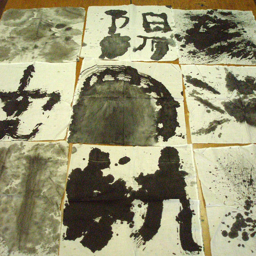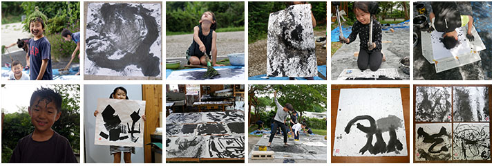 バケツに入ったたっぷりの墨汁と丈夫で広い和紙、ホウキやスポンジブラシ、葉っぱつきの枝などを用意します。この日子どもたちは全身黒い服で登場。‥どうなるかお分かりですよね?素晴らしい作品続出だったのに、新居の天井にまだ墨汁のほとばしった跡をつけたくなくてしばらくやりませんでした。外で思いっきりやる事にして復活したのは2016年夏のこと。やっぱり楽しくって2024年の夏にもやりました。ほとばしる笑顔と墨汁!!
