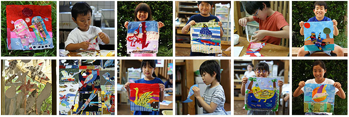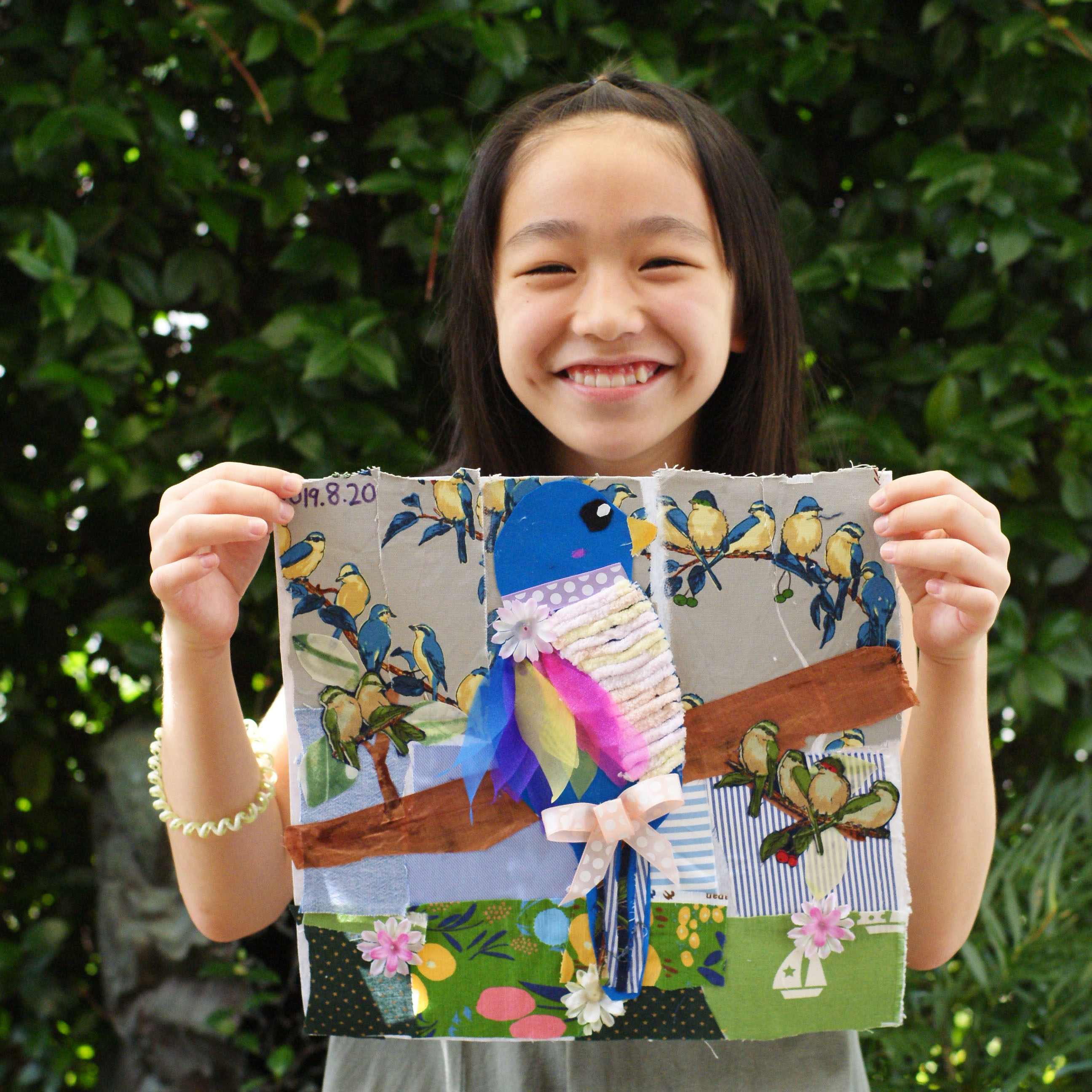 布の模様や質感を活かした「布絵」づくりも何度かやってきました。初回は子どもたちがイメージで描きやすいであろう鳥にしてみました(2回目は魚)。画面サイズの接着芯の上にベースの布を置いてアイロンでつけます。その上に木工ボンドを薄く塗った部品をどんどん貼っていきます。いろんな形の鳥たちがいろんなポーズで登場しています。紙の型紙も捨てられず窓に貼ったらまるで世界中の鳥たちの群れのようでした。