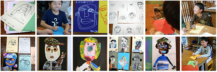まず2人一組になり手元の紙は見ないで相手の顔を一筆書きで描きます。昔私が大学で体験した楽しいワークショップです。どうしても手元を見ないではいられない子どもたちや「変になっていやだ!」と隠す人や、逆におふざけモードで大騒ぎの人たちも多い中、ピカソみたいな作品が続出!その後自画像も描いてそれを元に「かおコラージュ」づくりへ。雑誌などの切り抜きはあえて顔や人間ではない所を切って使うとおもしろいです。