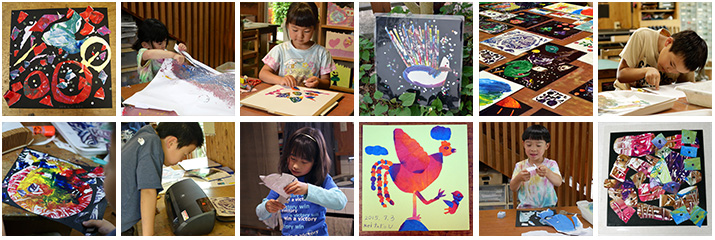 フィンガーペイントのテーブルの絵は紙に写し取って残します。それを切ってつくるコラージュは偶然の色合いやタッチが生かされた傑作ぞろい!自分は絵が苦手だと思っている子どもたちもこういう偶然のアートの力を借りればいい。台紙は白と黒を用意してあらかじめスプレーのりを吹きかけておくと、子どもたちは接着も簡単です。出来上がったらビニールに包みそのまま飾れるようにしたり、近年は全部ラミネート加工しています。