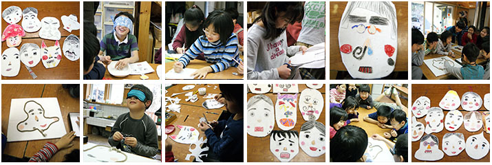 お正月にちなんで1月にやりました。目隠しをして見本のふくわらいをやってみるところからスタート。大笑いする子どもたちを見ているだけでシアワセになります。「笑う門には福きたる」その通りですね。材料はパネルシアターにも使えるネル生地とPペーパー、芯は厚紙ですからご家庭でも出来そうですね。人間じゃない作品もいろいろある上に、目隠しして組み立てると「うひゃあ」と驚くもの続出でした。