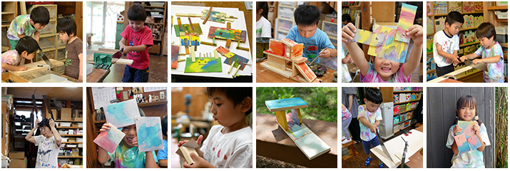 ノコギリはにいはるびじゅつでは一番多く使う道具です。毎年ようじクラスで初めてやる時は私かスタッフが2本のノコギリを頭の上に立てて「ノコギリム〜シ♪ノコギリム〜シ♪」と動かしながら出てきます。(ちなみにトンカチの時は「トンカチン♪トンカチン♪」と2本のトンカチを打ち鳴らしながら登場。)ノコギリを初めて手にする小さな人たちもこれで笑顔になるのです。ようじクラスではこの導入演技が大事なんですよ、まじめに。