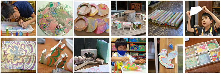 これも全員をトリコにするテーマです。普段落ち着きのない人も絵の具の「一滴落とし」はしばらくの間は息を詰めて慎重にやっていきます(そのうちビューッと出してしまうのですが‥)。出来た模様は紙や板などに写し取り、後日またいろんな作品に変身しました。マーブリングだけでなく子どもたちが大好きなテーマはどれも私たちの事前の準備と終わった後の片付けがとっても大変。なのでたま〜にやることにしたいです。