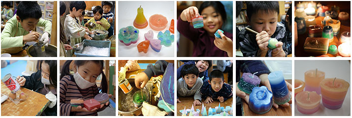 12月に隔年でやるテーマです。ただでさえ走り回り騒がしい子どもたちですから、ローソクづくりの期間は私は気が休まりません。床は思いっきり滑りますしテーブルの上の鍋にはお湯が煮立っています。でもすごくワクワクするし次の回にカップなどから出す時がさらに感動です! このローソクはもったいなくて使えずにどんどんたまっていたけれど東日本大震災の後の停電期間に初めて使ったというご家庭も多かったようです。