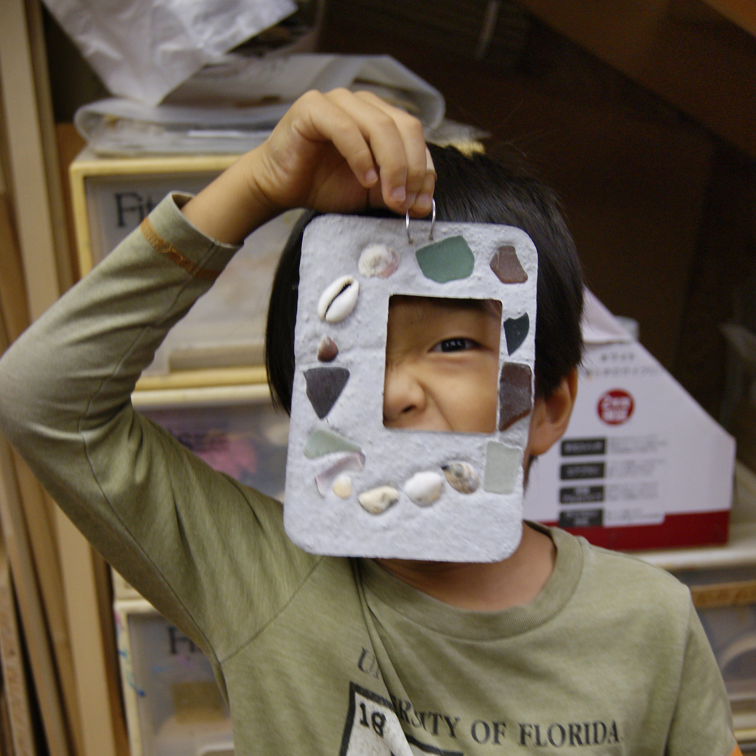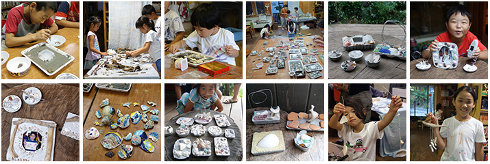 4〜5年に一度、夏休み明けの9月の1週目にやっています。子どもたちには「夏休みに海に行ったら貝がらとか拾ってきてね〜」と伝えておきます。それら「海のおくりもの」たちは、小さなカップに魔法の粉(実はモルタルです)を水で溶いたものを入れた中に鎮座間していきます。針金のペン立てを足したり、額にして写真を飾ったり、サンゴの風鈴にしてみたりとバリエーションも豊富です。
