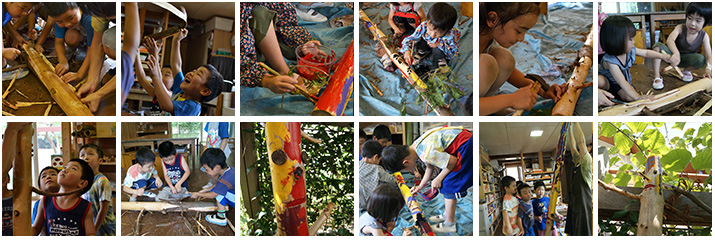 以前私も関わっていた『創造と森の声』という森のアートイベントの2012年のワークショップでもやらせていただいたテーマです。ようじクラスの子どもたちにも「森のいのち」の話をして始めます(まじめに聞いてくれるからかわいいです)。皮むきもノコギリで切るのもペンキでの絵付けもたのしい作業!午前クラスと午後クラスで1本ずつ造りました。ずっとびじゅつの入り口でみんなを迎えてくれた森のカミサマです。