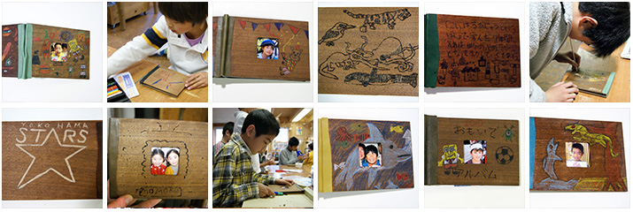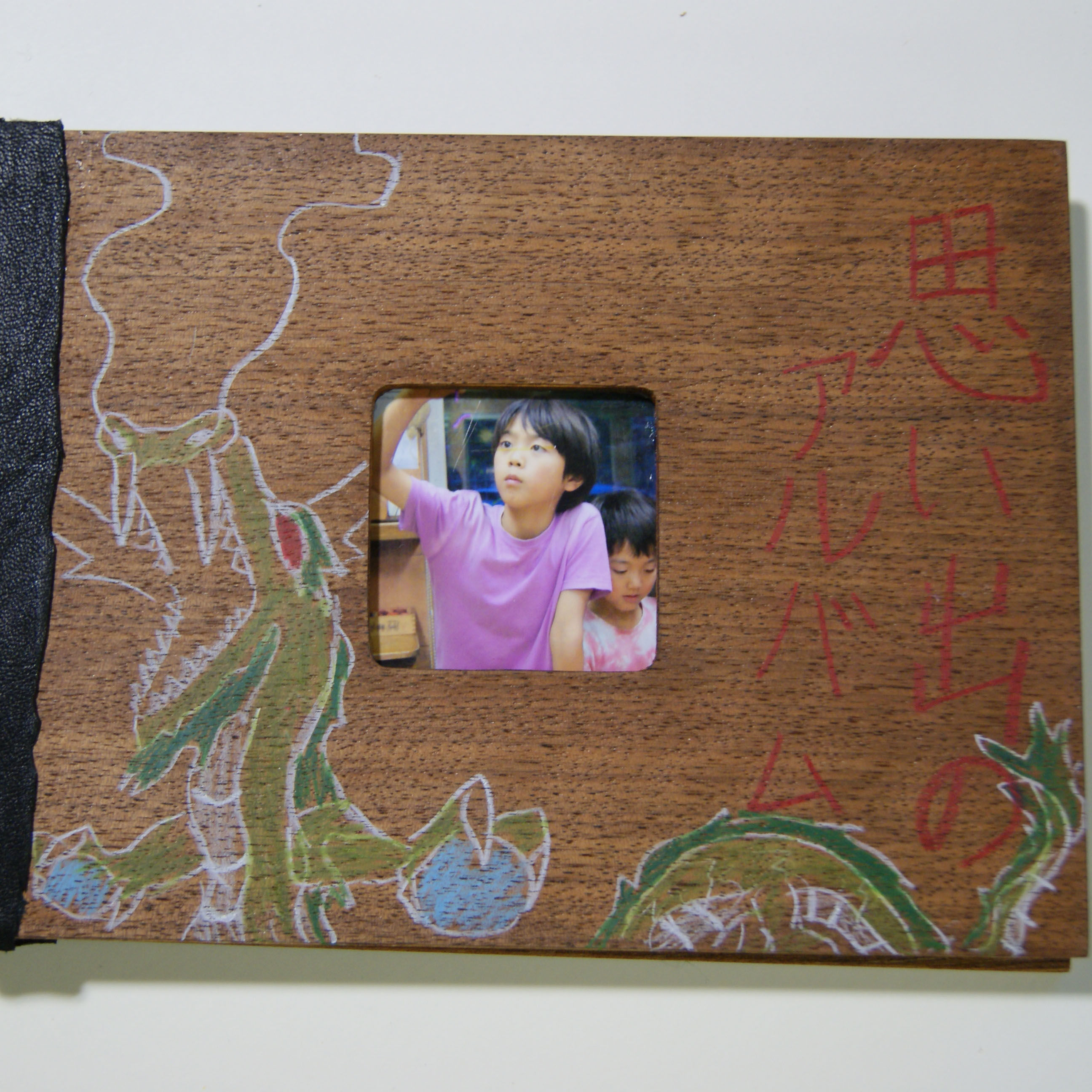 3月につくるものは「おもいでの〇〇」というタイトルがよくつきます。このアルバムはまさに思い出にふさわしいものでした。木工家の友人から小さな窓のあいた板を沢山もらったので、これを思いつきました。窓に自分の写真を入れ、中は市販のアルバムを切って製本しました。木ですから表紙には彫刻刀で彫ったりハンダペンで焦がしていろいろ描いたりも出来ます。2009年度に居た子どもたちだけが持っている思い出の品ですね。