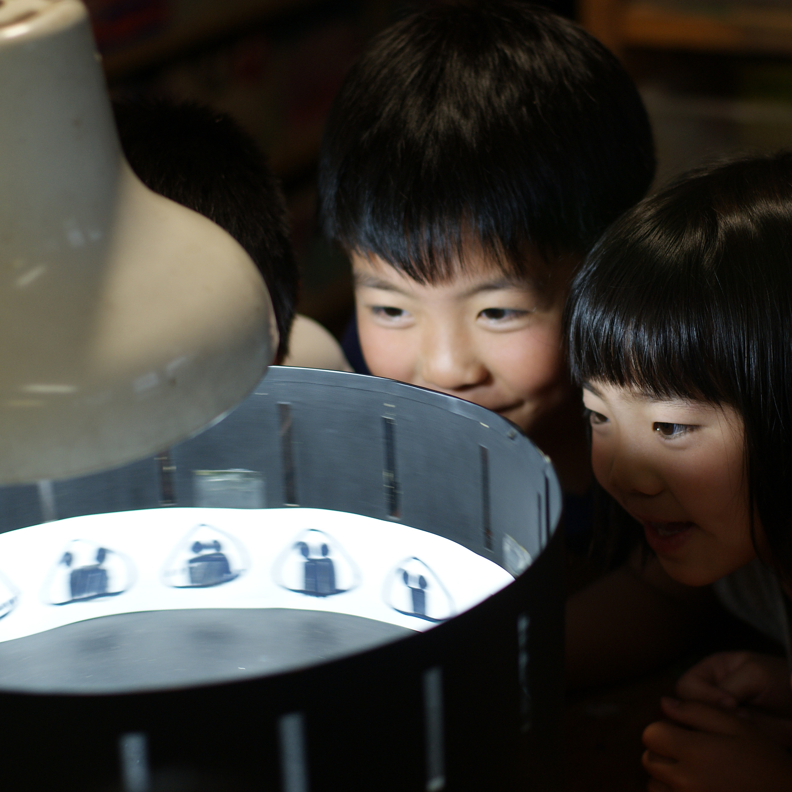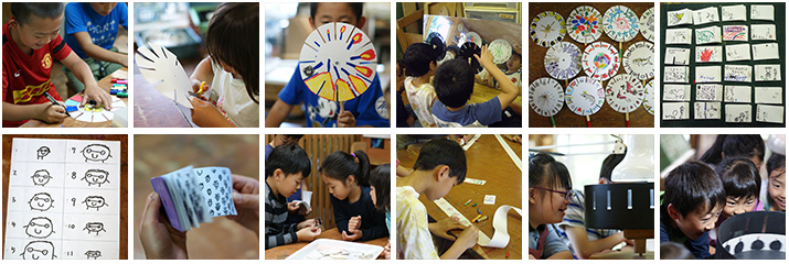 パラパラマンガやゾートロープ(ジブリ美術館に行ったことがある人はご存知ですよね)など、どうして絵が動いて見えるのか私も未だに不思議です。子どもたちには「これがアニメーションの始まりなんだよ」と説明しますが、不思議な事って子どもたちもくいつきが違います。鏡に映したり隙間からのぞいたりする表情は興味しんしんで「うごいてるぅ!」と歓声が上がります。作品も熟孝されたのもテキトーなのも両方おもしろかったです。