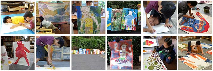 最初は造形作家のハシバヨシコさんに教えていただきました。自分の姿を布や丈夫な画用紙に型取ってもらい絵の具で色をつけます。筆の他にもローラーやスポンジ等使うと大胆に塗れます。小さい人たちのクラスはもちろん、大きな人たちもワイワイ楽しめるテーマ。作品紹介の時は「はい、ぶんしんのじゅつ〜」と言って同じポーズをしてもらうとおもしろいですよ。みんなもう分身よりもずいぶん大きくなったことでしょう。