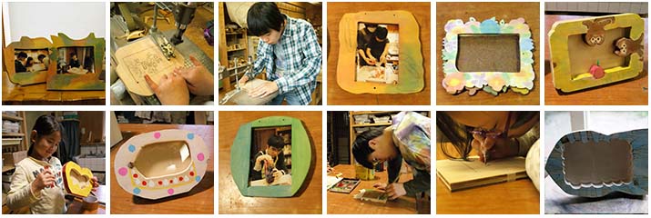 写真立ても太い枝に切り込みを入れたり、額縁みたいにしたり、アクリル板とマット紙ではさんでみたりといろんなつくり方をしてきました。下の写真は2011年の時のもの。外形も窓の切り抜き方も子どもたちがそれぞれ自分で考えたので、写真を入れずそのまま置いておいてもいい感じの作品になりました。窓の形にぴったりの写真を見つけて入れなければいけないのも不便と思わず楽しみにしてみたらいいと思います。