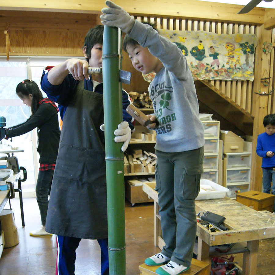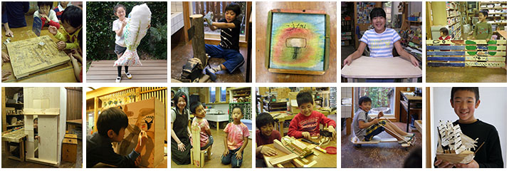 月〜金ようクラスでは大体毎月1回は自由せいさくがあります。「来週はじゆうせいさくだよ」と言うと「やったー!!」と歓声をあげる子どもたち。アトリエの中の材料や道具を自由に使い何をつくってもいいのです。まずは大きい作品を紹介します。木や竹、板でつくった物が多いです。何時間もかけて切ってヤスリをかけて‥完成に至るまでには本人の努力はもちろん、スタッフの助けや仲間の協力無しには無理だったものも多いです。