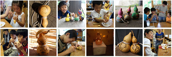 ポンぴ〜シャカサウンドクラブのゆうさんとエージさんはひょうたんで楽器をつくる名人です。お二人に教えていただいた笛やマラカスも取り入れて、2010年のなつやすみフリーデイでは「ひょうたん」をテーマにしてみました。そのままでもかわいいひょうたんですが、子どもたちが顔を描いたりするともっと更に愛しいものに!マトリョーシカみたいにした子もランプにした子もひょうたんの絵を描いた子もいてひょうたんづくしの夏でした。