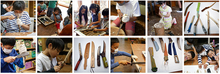 男の子たちはとかく剣のたぐいが好きみたいです。じゆうせいさくの日はいつも誰かしらがせっせと肥後守(ひごのかみ)や切り出しナイフで長い角材を削って剣をつくっている場面を目にします。ならば全員でやってみようと思いました。ナタで大まかに側面をおとしていき、ナイフでひたすら削った後は紙ヤスリでスベスベにします。堅い枝もみんなよく頑張って仕上げました!ですから「ペーパーナイフ」としての実用性には目をつむって下さいね。