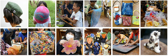 にいはるびじゅつ初期の頃は牧場の羊の毛を子どもたちともらいに行き、洗って乾かして機械ですくという全行程をやったことがあります!今はもうすぐに使える原毛を専門店から購入しています。お湯をかけてパタパタコロコロし続けるボールやマット、バッグづくりでは何度も「あと何分?」と訊いてくる子続出。お湯を使わないニードルフェルトの方が自由せいさくでも人気がありお手軽なフェルトづくりかもしれませんね。
