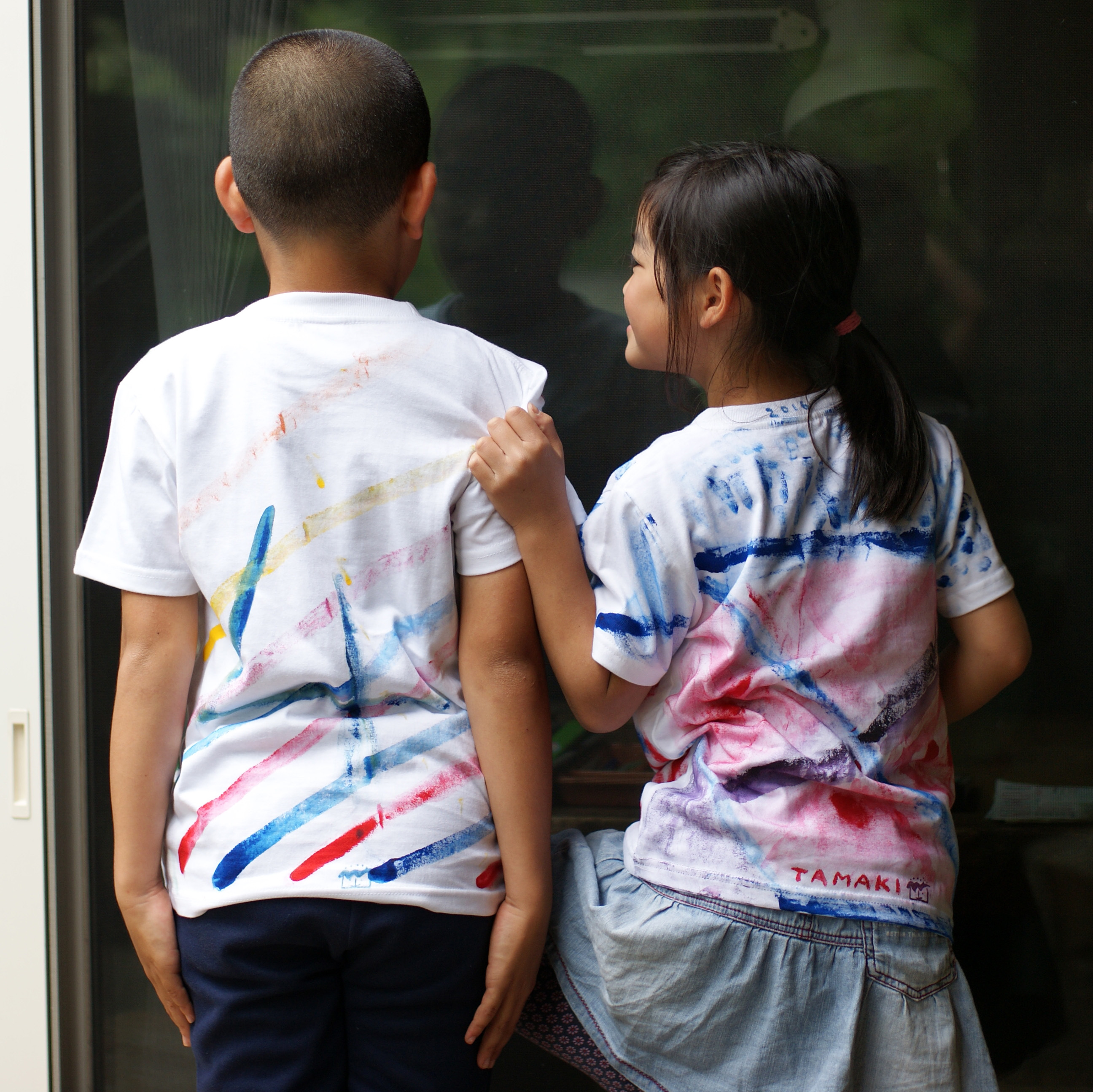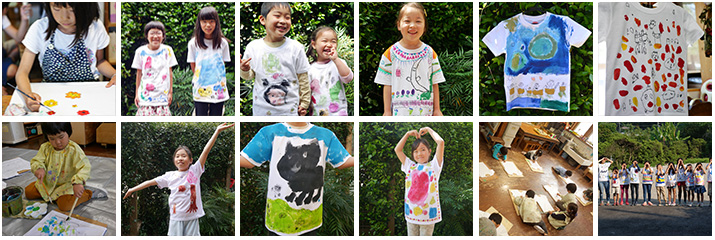 これと「まだらぞめ」は一年おきにやっています。どちらもTシャツなので毎年春から新しい作品を着ることができます。びじゅつの日は毎回これを来てくる子、お父さんやお母さんのTシャツをつくった子、どちらも月日と共にいい風合いになっていくのは嬉しいものです(私も描いて欲しいです)。Tシャツだけではもったいないので布にも描いてランチョンマットにしたり、ミニクッション用に描いて後日縫ったりした年もあります。