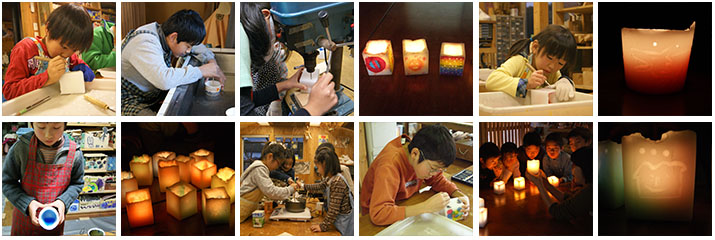 ローソクづくりの経験者で3年生以上はランタンにした年もありました。牛乳パックや丸いヨーグルトの容器にランタン用のロウを流し込み、ある程度固まったら中のロウを出して空洞になった形がそのままランタンとして残るというわけです。あとで中に色も付けます。使用時は別のローソクを入れて灯すのでランタンは溶けずにずっと残ります。周りにも彫刻刀で模様を彫ったり絵を描いたりしてみんな凝ってつくりあげました。
