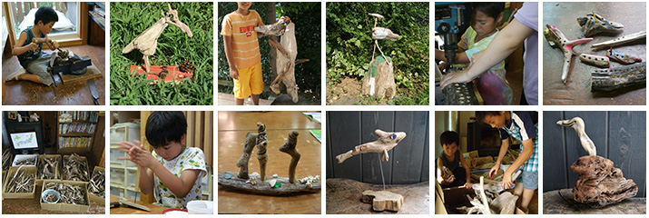神岡学さんという方が流木で人を創った作品集に心奪われて、2008年のなつやすみフリーデイのテーマは「りゅうぼくでつくる」に決めました。材料はいろんな方からいただいたりネットで購入したりして日本全国の(?)流木が揃ったので産地を記入した日本地図を貼りました。森から海へ巡り巡って来た自然の贈り物ですからね。大げさに言うならばこれらは子どもたちと自然とのコラボレーション作品です。2013年にもやりました。